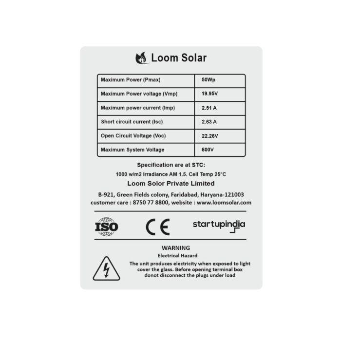 Loom Solar 50 watt mono panels are made of A grade mono perk cells and ultra cleared tempered glasses that does not break easily and gives 22% higher efficiency even in low light and cloudy weather. Loom solar is only company in india that makes mono panels using perk cells in 12 volt design. The additional feature includes 4 busbars, 36 cells and 25 years performance warranty. IP 67 rated junction box is given with MC4 compatible cable connector for higher module efficiency.
