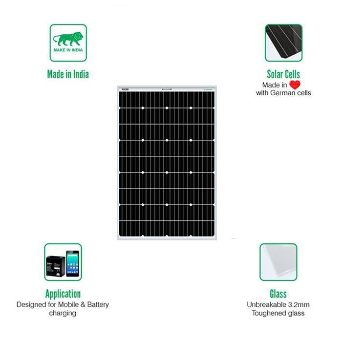 Loom solar 75 watt mono panels are made of A grade mono perk cells and ultra cleared tempered glasses that does not break easily and gives 20-25% higher efficiency even in low light and cloudy weather. Loom solar is only company in india that makes mono panels using perk cells in 12 volt design. The additional feature includes 4 busbars, 36 cells and 25 years performance warranty. IP 67 rated junction box is given with MC4 compatible cable connector for higher module efficiency.